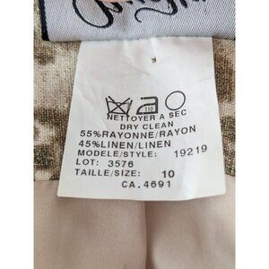 This vintage women's blazer jacket from the 1980s by Nueva is a glamorous metallic gold shimmer piece with puffed sleeves, perfect for a special occasion. Made of a linen blend material, this original blazer exudes a classic yet stylish look with its beige color and shoulder pads. This United States-made blazer is a size 10 and offers a regular fit, making it a unique and fashionable addition to any vintage clothing collection.