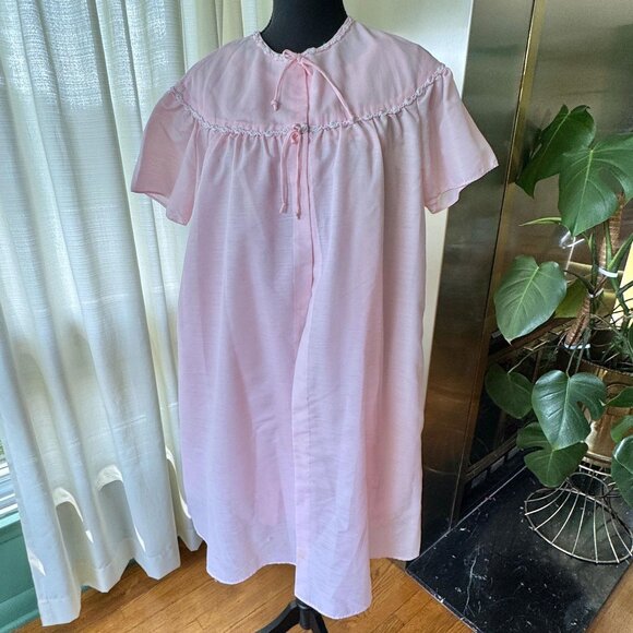 Includes an open front peignoir, short sleeves with two buttons at the neckline and a little drawstring bow. A sleeveless negligee, with ruffled hem and a gathered embroidered laced bust. Bouffant granny underwear, so very adorable!