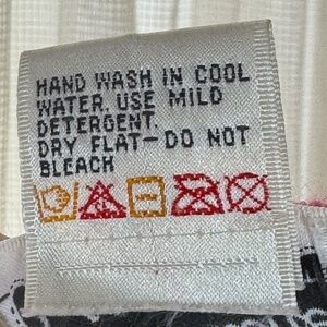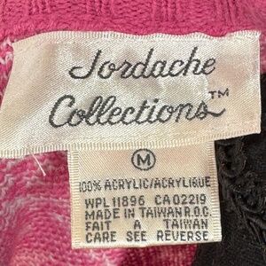 Flashback to the 80s GenX teenage years with this Jordache oversized, extra long sweater in pink and white. Pattern is somewhat of an abstract paisley, it has a crew neck and long sleeves. Material is 100% acrylic.