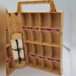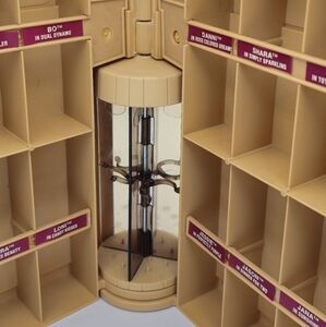 **wear to front labels on both sides of case as well as interior doll labels & doll holder carousel.