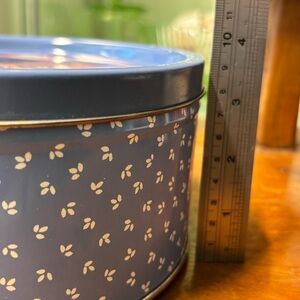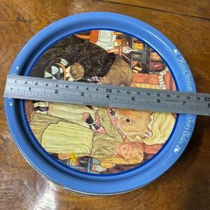 Vintage 1981 Michael Hague tin featuring Hans Christian Andersen’s Thumbelina. Charming and beautiful illustration with no damage to the image. The blue wrap-around graphics are also undamaged, with a very small amount of paint wear. The tin itself has some rusting, mostly along the interior inner rim.