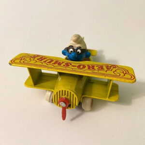 Vintage 1982 ERTL Smurfs Diecast Aero Smurf Yellow Plane Toy Hong Kong