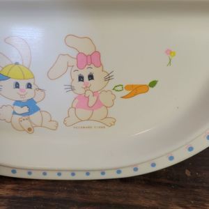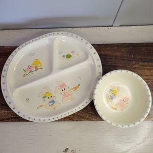 Vintage 1986 Peco Divided Childs Plate and Bowl Set Turtle Bunnies Mushrooms