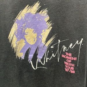 Vintage original 1987 Whitney Houston The Moment of Truth graphic concert tee. Dark grey Whitney Houston graphic on the front. Screen Stars tag, single stitch Tshirt. Size Large. 50% cotton, 50% polyester fabric. Good vintage condition with some general wear/fading/pilling to the fabric (possibly originally a black tshirt and has faded to look like a dark grey) and some wear/fading to the graphic. This shirt is an actual original vintage shirt from 1987, rare and very hard to find! Perfect piece for any Whitney Houston fan or collector! Please refer to measurements in photos for more accurate sizing. Please see photos, measurements are for reference only. Really offers welcome!