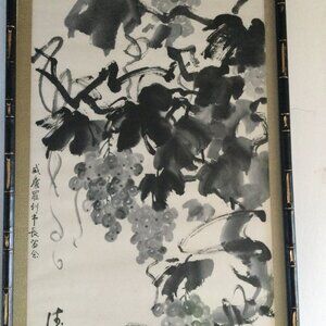 Vintage 1988 Chinese ink painting original grapes w vintage wooden frame signed