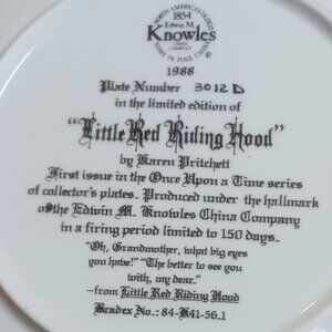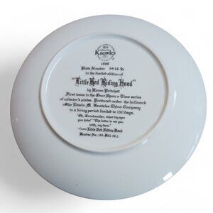 Vintage 1988 Limited Edition "Little Red Riding Hood" collectible plate by artist Karen Pritchett, made by Knowles Fine China First Issue. Certificate signed by artist. This exquisite plate, number 3012D, comes with a signed certificate of authenticity, a booklet detailing the art piece and the artist, and the original box. A beautifully preserved item perfect for collectors and admirers of fine China and classic fairy tale art. Measures approximately 8.5" across.