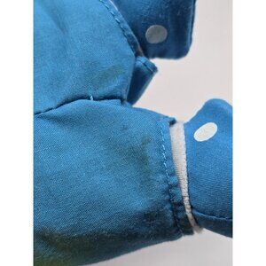 The clothing has some discoloration and staining. The bottom of the feet have darker stains.