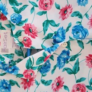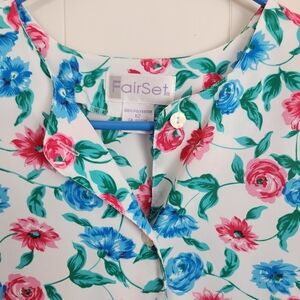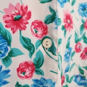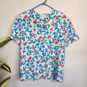 Vintage 1990s Blue Short Sleeve Bright Floral Blouse Top 80s Office Preppy 90s