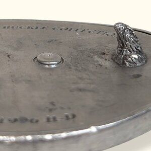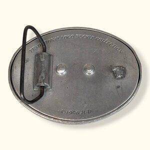 This vintage belt buckle by Harley-Davidson comes to us from 1996 and is made of a silver tone metal. The buckle is oval in shape and has a studded border with a star accent on either side. The center of the buckle features a traditional HD logo in a gold/brass tone, and behind/around it there is a black leather inlay. The back of the buckle has a hinged loop for the belt to go through, as well as a small pin shaped like an eagle's head (VERY COOL - pic 5). The back says, "TRADITIONAL LOGO BUCKLE COLLECTION" and "(C)1996 H-D".