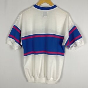 Vintage 1990’s Jordache Jersey Style Oversized Tee Shirt in White • Sleeve Stripes in Pink + Blue • Crewneck • Short Sleeved • 1980’s