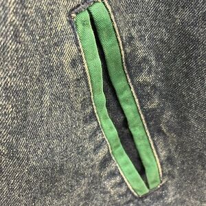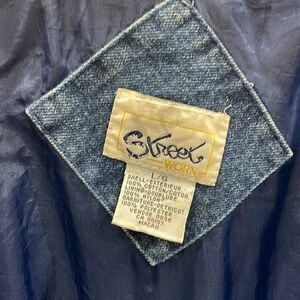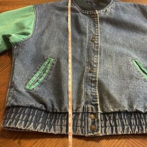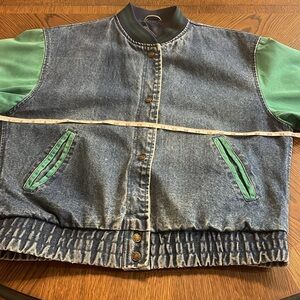Vintage 1990s stylish Street Worn denim bomber jacket with green sleeves. Features ribbed cuffs and collar, two front pockets, snap button closure. Perfect for casual wear. Unisex style. Size Large. Good pre owned vintage condition. Some light wear to the fabric, light fading to green fabric, there is lettering that was written in black marker on the logo tag that is pretty faded. Pleased refer to photos for more accurate measurements.
