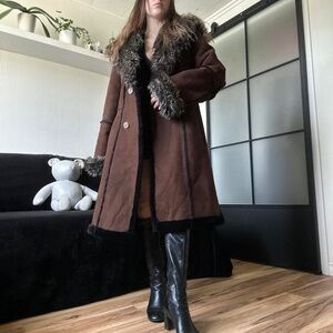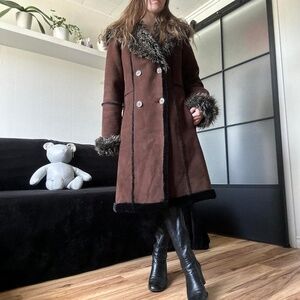 Vintage 1990s Suede Dark Brown Coat with Faux Shearling Fur