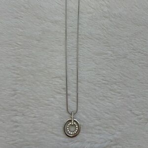 This vintage Swarovski necklace from the 1990s features an elegant double circle pendant — a sparkling pavé crystal ring suspended within a sleek, polished outer ring. The crystal detailing also extends to the connector loop, adding shimmer from every angle. Finished with its original silver-tone snake chain and Swarovski swan logo tag, this piece is perfect for collectors or anyone who loves classic, refined jewelry.