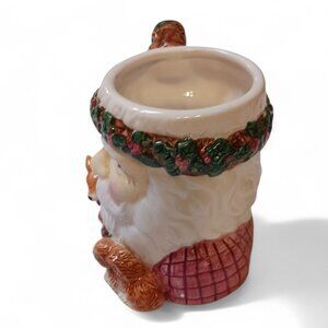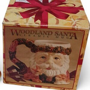 Vintage Woodland Santa Double Capacity Christmas Mug for sale! Circa 1990's. This charming handpainted mug features a festive Santa amidst small rabbits and deer, evoking a whimsical winter wonderland. It is in excellent condition, with no chips, cracks, or crazing, and comes in its original box. Measures 5" high, 3" across the mouth, and 6.5" from handle to rim. A unique and delightful addition to your holiday collection. Perfect for hot cocoa or coffee, this vintage mug will bring joy to your Christmas celebrations. Please note not recommended for dishwashers.
