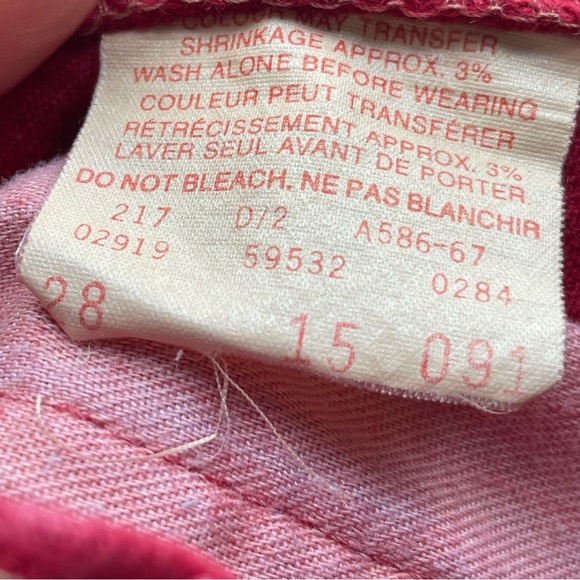 Vintage 1991 red 532 jeans by Levi's. High waisted and tapered leg, as was the style in the day. 100% cotton and made in Canada. Made to last, these jeans are solid and look great. Some minor signs of wear as shown, this is to be expected for a pair jeans that is 35 years old. Size tag says these are 28, but vintage sizes are different than today's. Measurements suggest it is a size 24. Please look at the measurements below to make sure these fit, perhaps compare to a similar garment in your own closet.