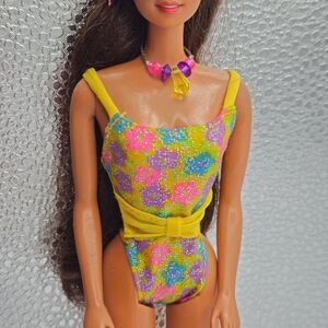 Barbie and her friends make every beach glitter! Look for them all! Teresa glitters from head to toe! Comes in original swimsuit, necklace & headband. She's also wearing shoes that didn't originally come with her but surprisingly are a perfect compliment to her bathing suit!