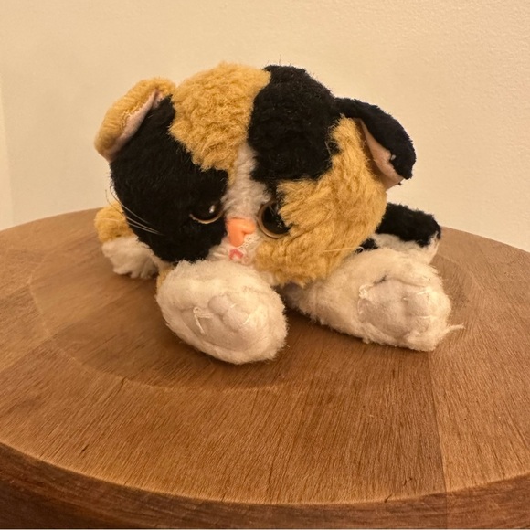 TYCO Kitty Kitty Kittens calico cat. Orange, black and white colour. “Purrs”. Kitten has some matted fur from being washed. The tag is a bit faded and has a tear, as seen in the listing photos.