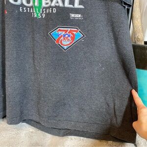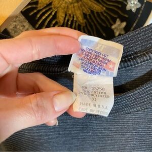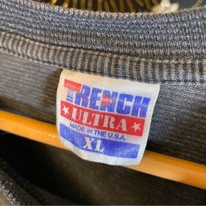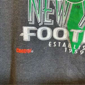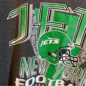 1994 vintage short sleeve NFL graphic tee by Trench. Made in USA. Single stitch. Grey and black thin stripe. Big New York Jets graphic on the front, which has a bit of cracking. The shirt has several white spots, which can be seen in the photos. Otherwise very good vintage condition. Size XL. Last photo to show shape of shirt. The dark spot on the bottom is a shadow.