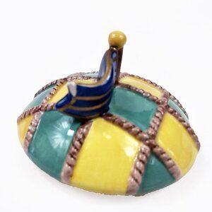 Adorable Cookie Jar-Fitz & Floyd Hot Air Balloon Carrying A Family Of 4 Bunnies. Mom and Dad With 1 Sleeping Baby and Another Wide Eyes Open. A Very Nice, Colorful Piece From Sri Lanka.