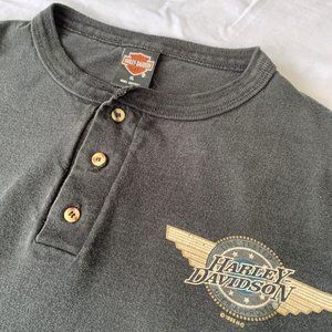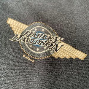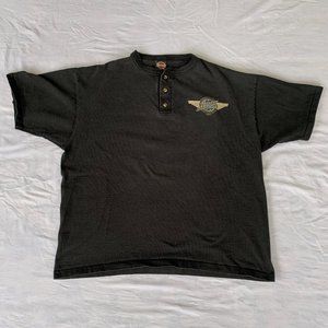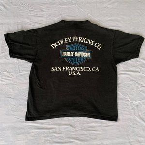 Vintage single stich Harley Davidson tee with quarter button from 1995. Rear graphic features Dudley Perkins Co. from San Francisco, California USA. Tee was made in USA.