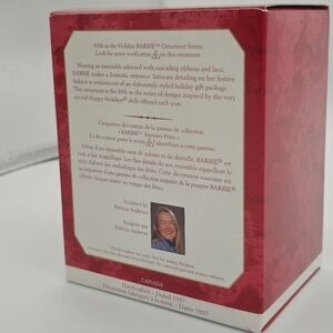 Wearing an ensemble adorned with cascading ribbons and lace, Barbie makes a dramatic entrance. Intricate detailing on her festive fashion is reminiscent of an elaborately styled holiday gift package. This ornament is the fifth in the series of designs inspired by the very special Happy Holidays dolls offered each year.