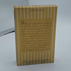 Lockets were very popular in Victorian times and Barbie is pictured inside the locket ornament wearing a burgundy coat with a white fur collar and a white muff is keeping her hands warm. Inside the locket it says, "Inspired by the 1994 Hallmark Exclusive Victorian Elegance Barbie doll."