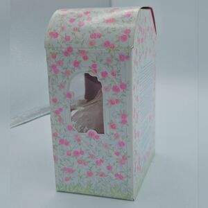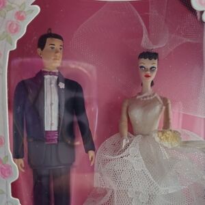 The set features a brunette bride wearing a lovely white gown with lace accents. Ken is wearing a handsome black tuxedo with a pink accent. This ornament works great as an ornament to celebrate the year of your wedding or some people have used as a wedding cake topper.