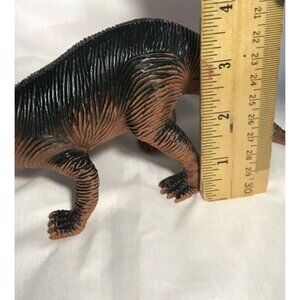 This Vintage 1998 TRICERATOPS Toy Figure from TM is a classic collector's item. The brown dinosaur features black detailing, striking blue eyes and is crafted from soft vinyl plastic for a unique tactile experience.