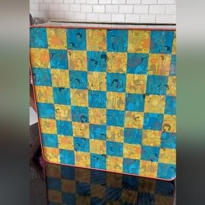 Tin case has some wear and slightly dented on one side. Chess peices are in very good condition. Instruction paper has a water srsin and reverse of Chess board has a small damage section.
