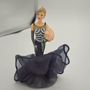 The 1999 40th Anniversary Barbie Ornament is a stunning addition to any Christmas Tree! For Barbies 40th anniversary, she makes a dramatic entrance in the sophisticated black gown. The pattern of the bodice of her gown is reminiscent of the striped swimsuit from her 1959 debut year.