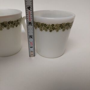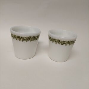 Vintage* Green crazy daisy pattern mugs. 70s. Set of 2. Pyrex by Corning #26 and 19. Made in NY, USA. Stands approx 3.5" tall. Milk glass. Holds 300 ml. Can b used in oven and microwave. (Not stove top or broiler.)