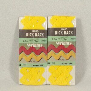 These are 2 unopened packages of vintage jumbo Rick Rack in Canary 086 by Wrights. It is a clear bright yellow.