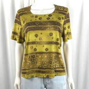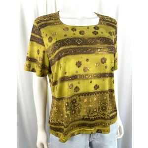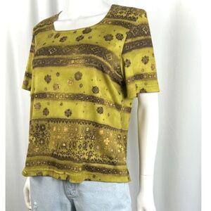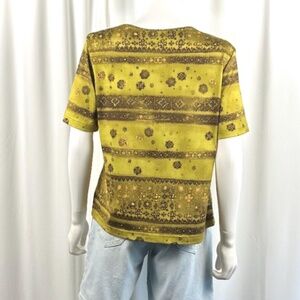 Vintage 1990’s 2000’s ‘Fred David’ Citrus Green Bohemian Short Sleeved Tee Shirt • Stripes • Floral • Boho • Scoop Neck • Made in Canada • L