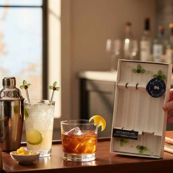 Celebrate the season with this factory-sealed set of 4 vintage Christmas glass stir sticks, issued by Loblaws circa 2004. Each stir stick is crafted from clear glass with a bulbous stirring end and finished with a green glass holly leaf and berries topper, creating an elegant and festive holiday barware accent.