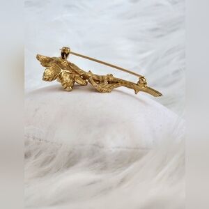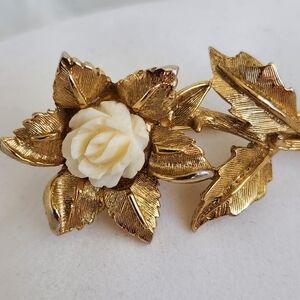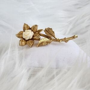 Elegant gold brooch featuring a detailed floral design with a ivory rose centerpiece. Perfect for adding a touch of sophistication to any outfit.