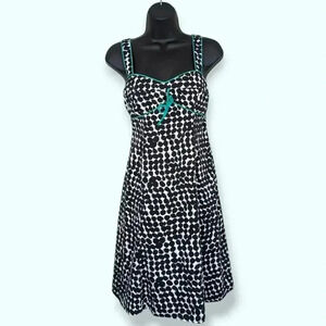 The dress is made in a black and white circular spotted pattern with green piping accents. It has a back zip and hook & eye closure, an elastic back, and a slightly padded bust. It has thin straps that can be adjusted with a button closure, and it falls around the knee.