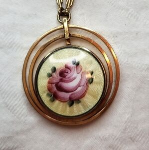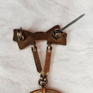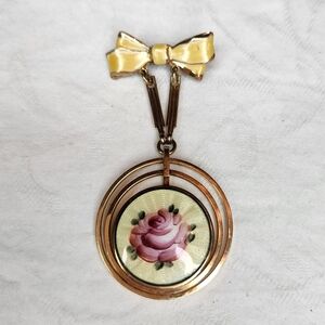 Yellow Croton enamal bow pin brooch hanging round hand painted Guilloche enamal yellow & pink rose circular sweetheart locket.