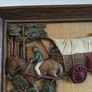 Vintage 3D Faux Wood Carved Horse Buggy Wall Hanging Retro Décor