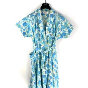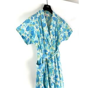 Vintage 1940’s 1950’s ‘Evelyn Pearson Lounging Apparel’ Long Belted Wrap Dress in Blue Green White Floral • Shawl Collar • Cap Sleeve • S/M