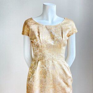 Vintage 50s 60s Gold Brocade Floral Short Sleeve Dress S
