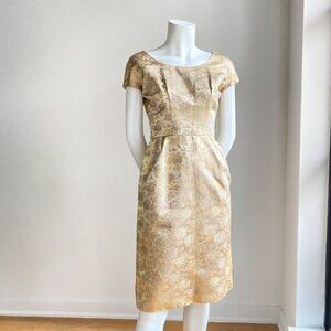 Vintage 50s 60s Gold Brocade Floral Short Sleeve Dress S.