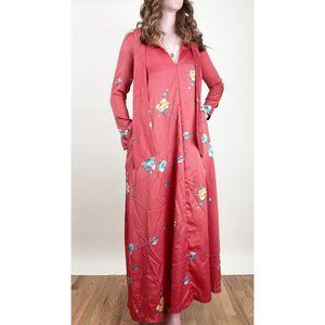 Stunning vintage handmade floral maxi dress duster house coat robe by Beatrice Pines. This features a plunging v-neckline, zip-down front, long sleeves, & an a-line silhouette, ties at the neck. Such a unique piece to style for year-round wear!