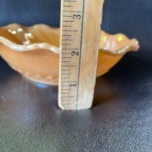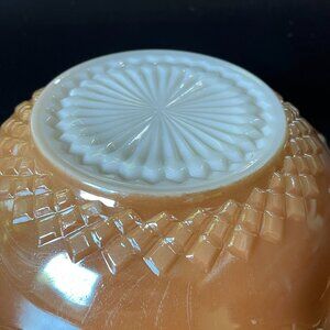 Fire King Peach Lustre Ruffled Swirl Pattern Fluted Bowl from the 50s. Beautiful peach lustreware! This is a ruffled 6.5 inch dish by Fire King circa 1950s. The bowl bottom has a gorgeous diamond pattern. Very nice vintage condition with some small signs of wear.