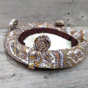 The brown and yellow paisley printed fabric feels like cotton or a cotton blend.