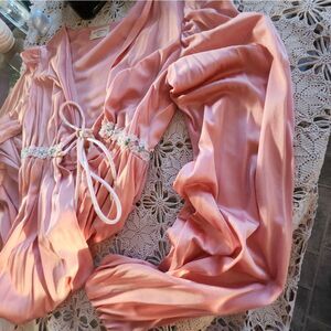 Vintage 50s Pink Satin Robe Puff Sleeve Maxi Waistband Cottagecore Fairy Vday