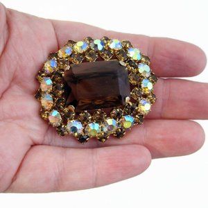 Oval shaped pin with rectangular cut glass centre stone in brown surrounded by smaller topaz stones and then larger aurora stones in a gold tone metal setting. Swivel clasp at back but no markings. Very Sparkly!