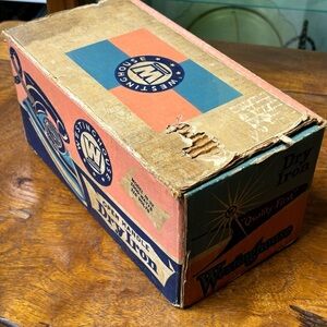 Vintage 50s Westinghouse Dry Iron clothes iron with original packaging. This vintage treasure would look amazing as part of a display. It’s in fair used condition, with some fraying to the fabric cord cover, a chip on the top of the temperature dial, and general wear from use over time. (I would not recommend actually using it for safety reasons). The box is worn but sturdy. Original instructions are included.