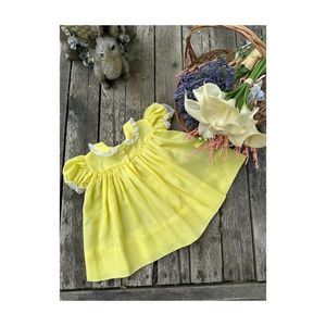 No brand, size or fabric tags. Double button rear neck closure. Short puff sleeves, rounded peter pan collar trimmed in white lace. Yellow and blue smocking details across the bodice of the dress. NO stains, holes or tears. Pet and smoke-free studio.