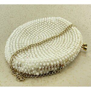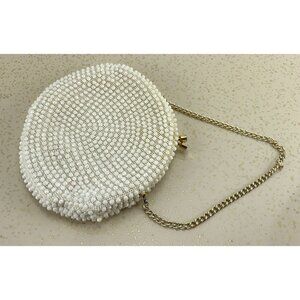 Stunning little cream beaded clutch purse. Could be used as a wristlet, chain is somewhat short. Ivory/cream beads, kiss lock clasp, gold tone accents. Perfect as a wedding purse or any formal evening event.