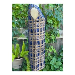 This beauty has all the Cleopatra, Queen of the Nile vibes. No tag. Approx size S/M based on measurements. Fabric may give a little, but not stretch. Quilted brocade fabric in a metallic gold and electric blue that sparkles! Centre back lightening zipper closure. Sleeveless, tear drop shaped neckline. MIDI length. Fully lined. Seams finished with finishing tape. Well constructed. No stains, holes or tears.